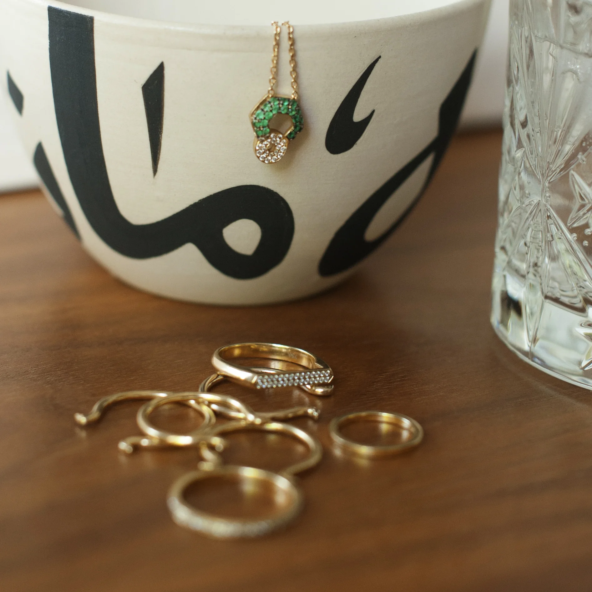 Add colour - layers of gold look sleek and minimal, then blend in a hint of colour via studded gemstones - see the Essentials collection for versatile options.